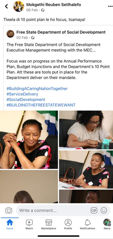 Further scrutiny of his Facebook account he shared a Free State Social Development post and captioned it “Tlwela di 10 point plan le ho focus, tsamaya! (leave 10 points pan and focus, go!)