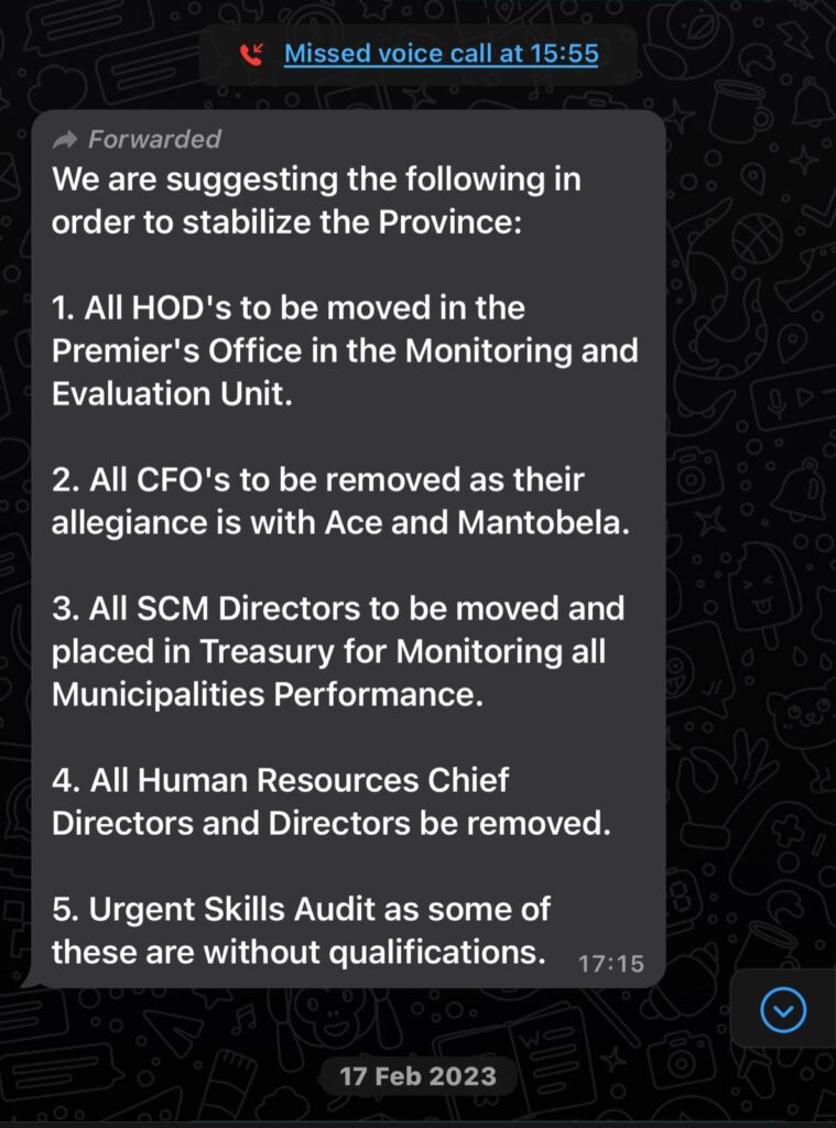 In February just after the provincial conference, we received the below WhatsApp text explaining in detail how the newly elected leaders will capture the government purse.