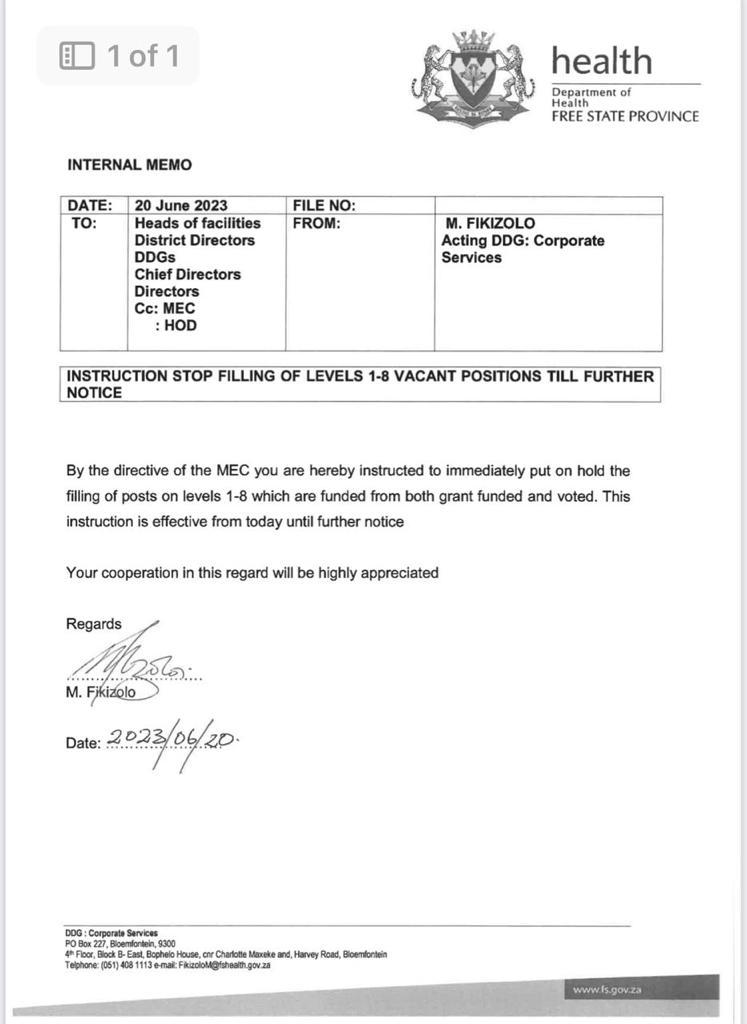 Bloemfontein – Hardly weeks after we reported a letter halting vacancies at the Free State Department of Health and purging hospital CEOs, there is more.