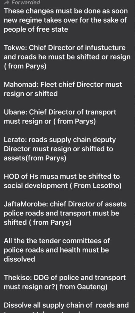 The text was shared even before the EXCO changed but the content of the texts is exactly what happened as soon as Joyce “Pretenders” Mathae became MEC.