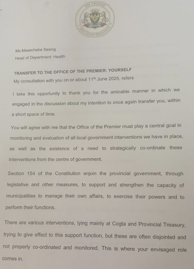 In other news, Masechaba Sesing, the embarked Health Head of Department is heading to Office of the Premier (Lindela) with effect from the 1 July 2025, that’s according to the letter in our possession.