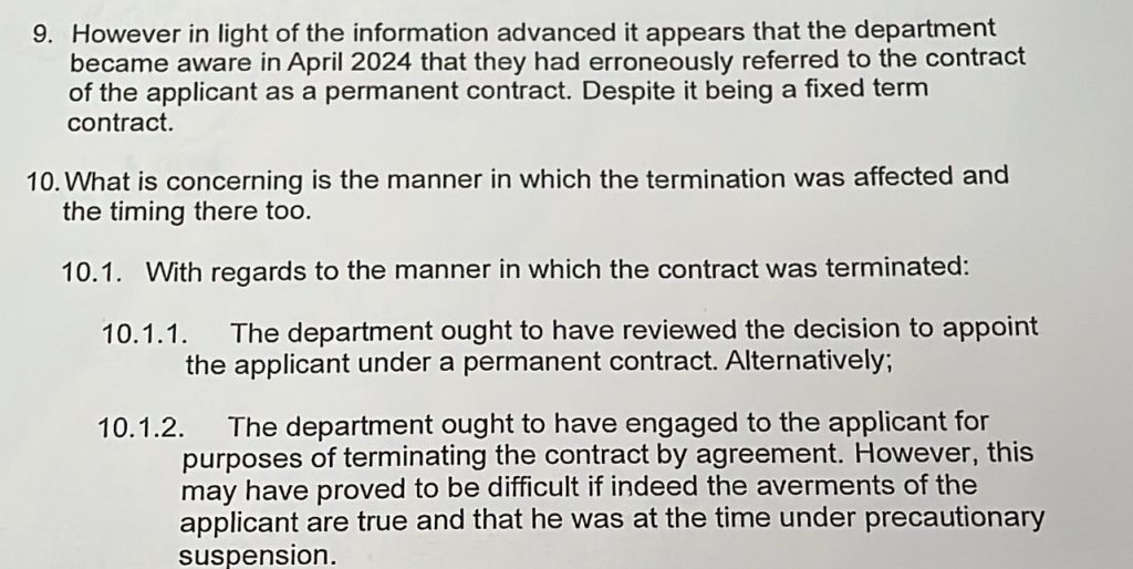 What’s even worse is the department wants labour court to declare the appointment of Masilo unlawful when they terminated his contract in April 2024, there is no employer/employee relationship but this is aimed at blocking bargaining council from hearing this matter in August.