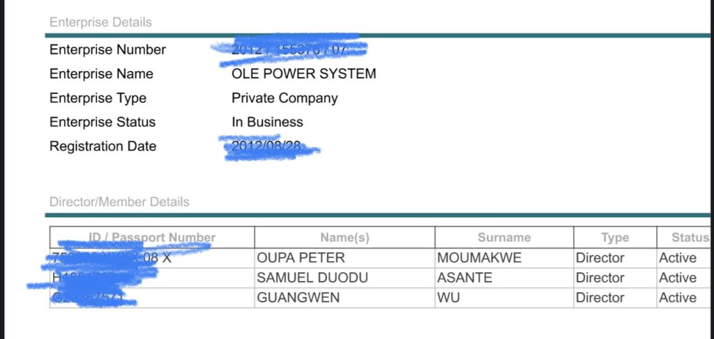 The Vaal based company was appointed on the 1 October 2017, by Sugar Ramakane, former Municipal Manager at Setsoto Local Municipslity, is owned by Oupa Moumakwe and two foreign nationals: Doudu Asante, a Ghanaian and Guanwen Wu, a Chinese.