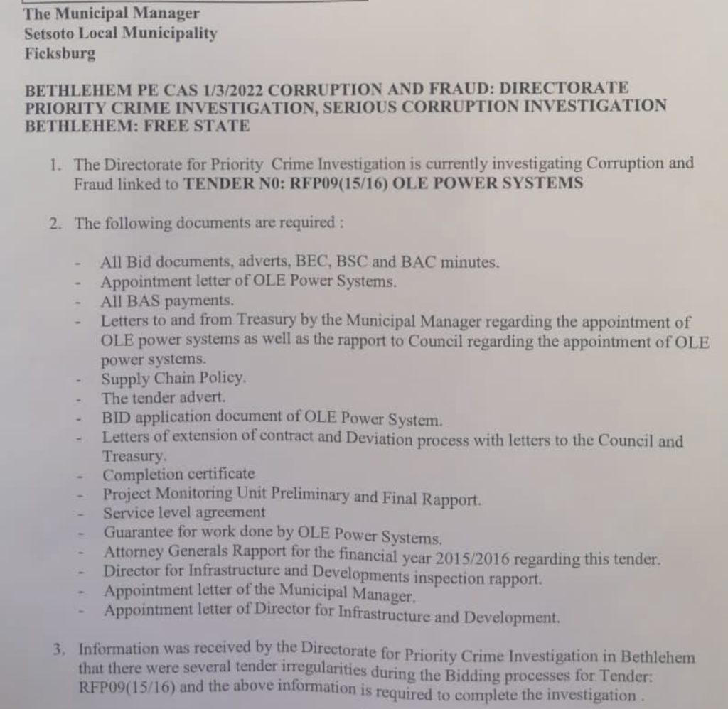 According to the Hawks’ self explanatory letter dated 25 April 2022, in our possession, they are requesting documents in relation to alleged fraud and corruption.