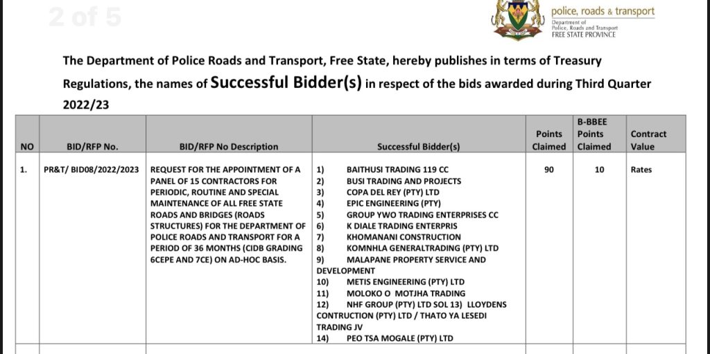 Apart from New Beginnings Project contract being terminated, there were two other panel tenders that were terminated since Joyce “Pretenders” Mathae, Free State Premier took over as MEC for Community Safety, Roads, and Transport in 2023 and at least three companies have taken the department to court.