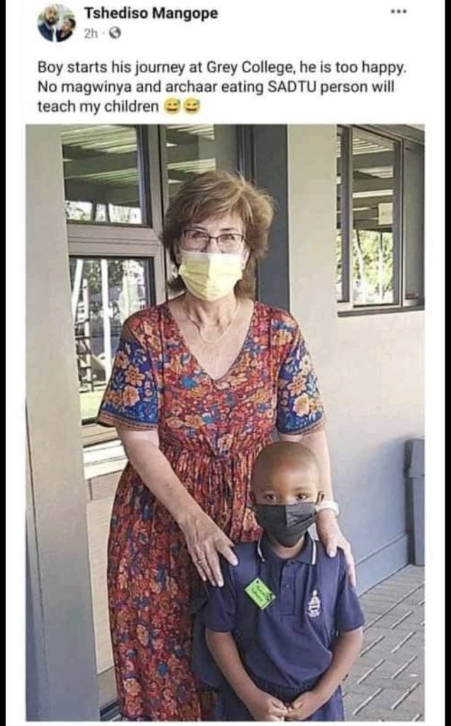 Mangope who was working for COGTA at the time shared a picture of his son at Grey College with a caption clearly stating no magwinya and atchaar eating SADTU person will teach my children.