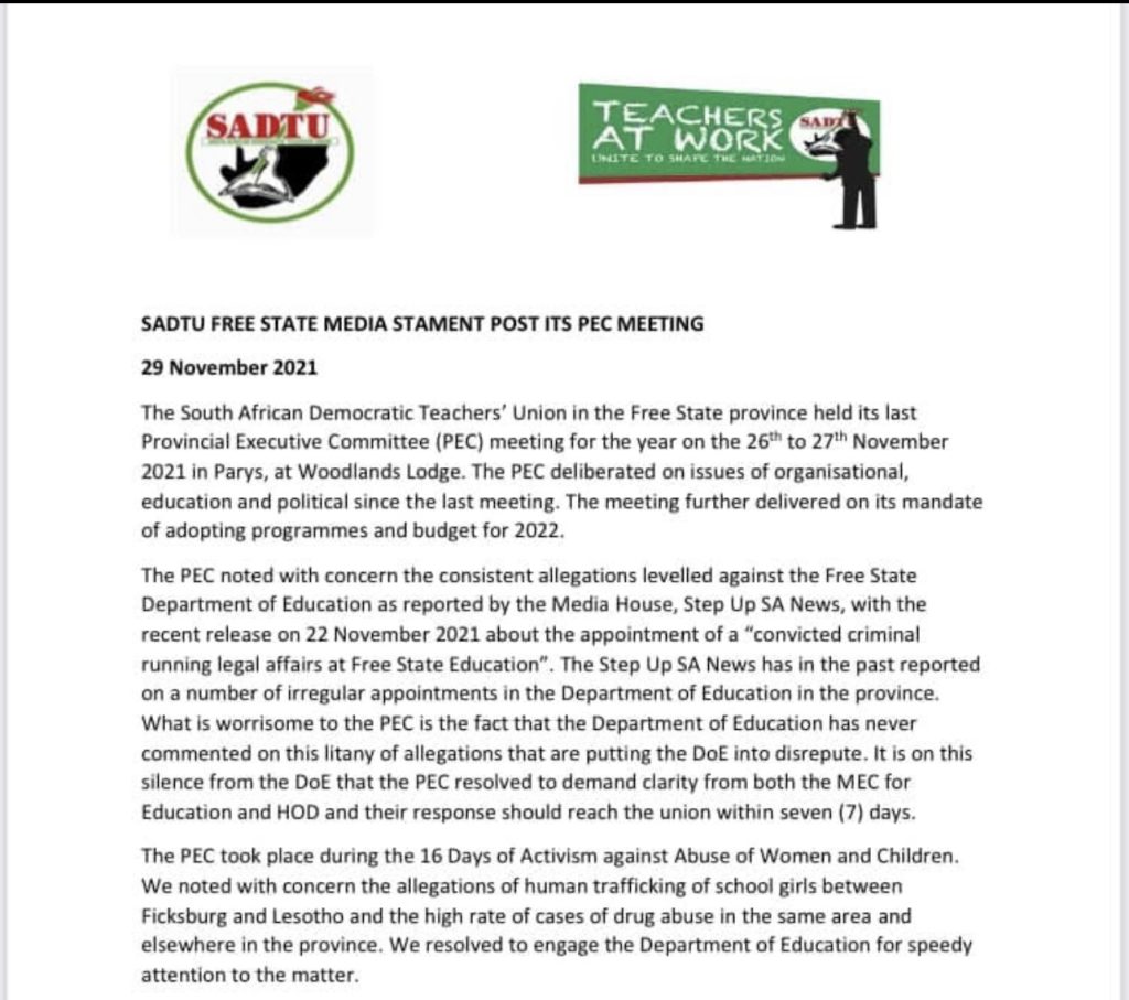 The last time SADTU made such demands was in 2021 when it gave the department 7 days to respond to SADTU PEC on irregular appointments and a convicted criminal employed by the department we reported on. Four years later SADTU has never uttered a word despite PSC confirming irregular appointments.