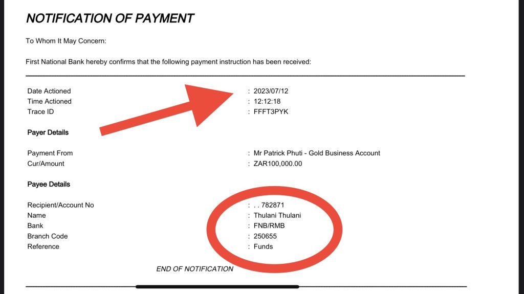 Four days later, on the 12 July 2023, R100 000 was paid via FNB with Thulani Thulani as reference.