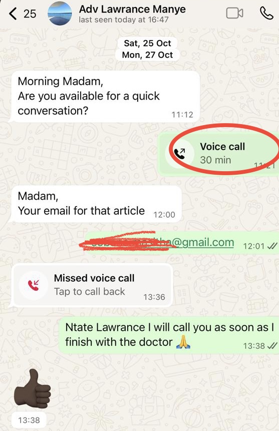 Manye sent Masemene another asking for her email address and she responded a minute later providing her email address.