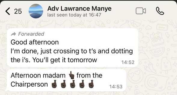 On Monday, Manye forwarded Masemene a text from Advocate Baloyi-Mere, chairperson of the disciplinary hearing.