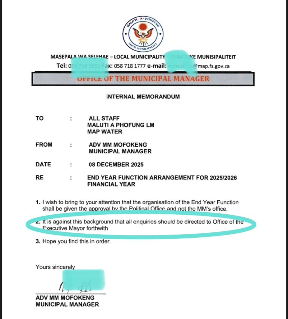 This time, Mofokeng has written a memo to staff washing his hands year end celebrations and referring any questions to Malekula Melato, Executive Mayor.