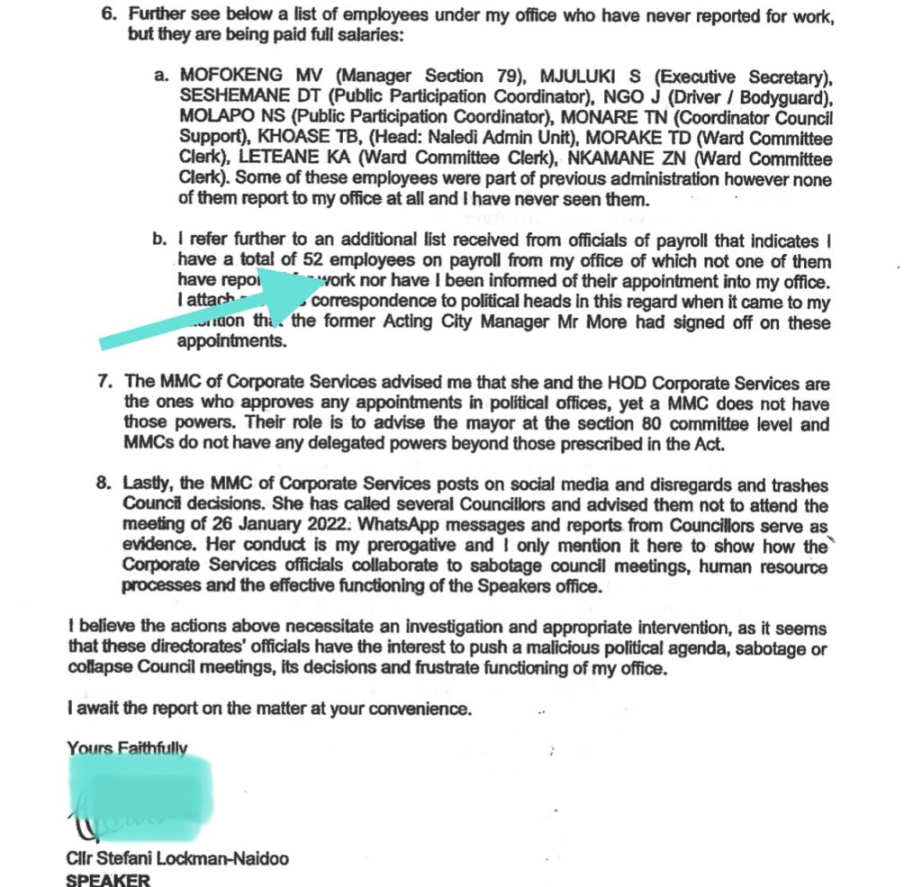 This followed alarm bells sent out by Advocate Stefanie Lockman-Naidoo, erstwhile speaker of Mangaung Metro after discovering her office has a total of 52 employees on her payroll but she had never seen any of them.