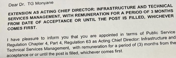 Compounding the situation, Dr Monyane, a Director appointed in May last year at Department of Education and transferred to Health few month later, is currently acting as Chief Director: Infrastructure and is reportedly receiving an acting allowance.