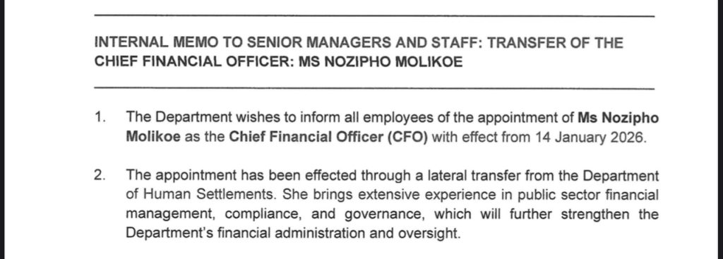 Bloemfontein – The controversial transfer of Nozipho Molikoe, Chief Financial Officer (CFO) at the Department of Human Settlements, to the Department of Social Development appears to be the culmination of a plan allegedly conceived in the aftermath of the chaotic ANC conference held at Imvelo Safari Lodge.